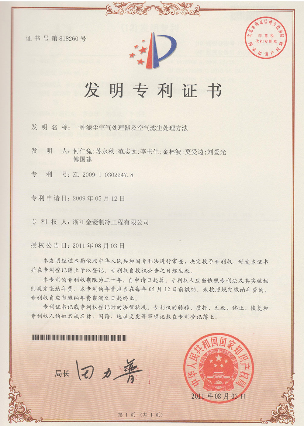 Patent certificate of Thermal plastic heat transfer module for counter flow closed cooling tower