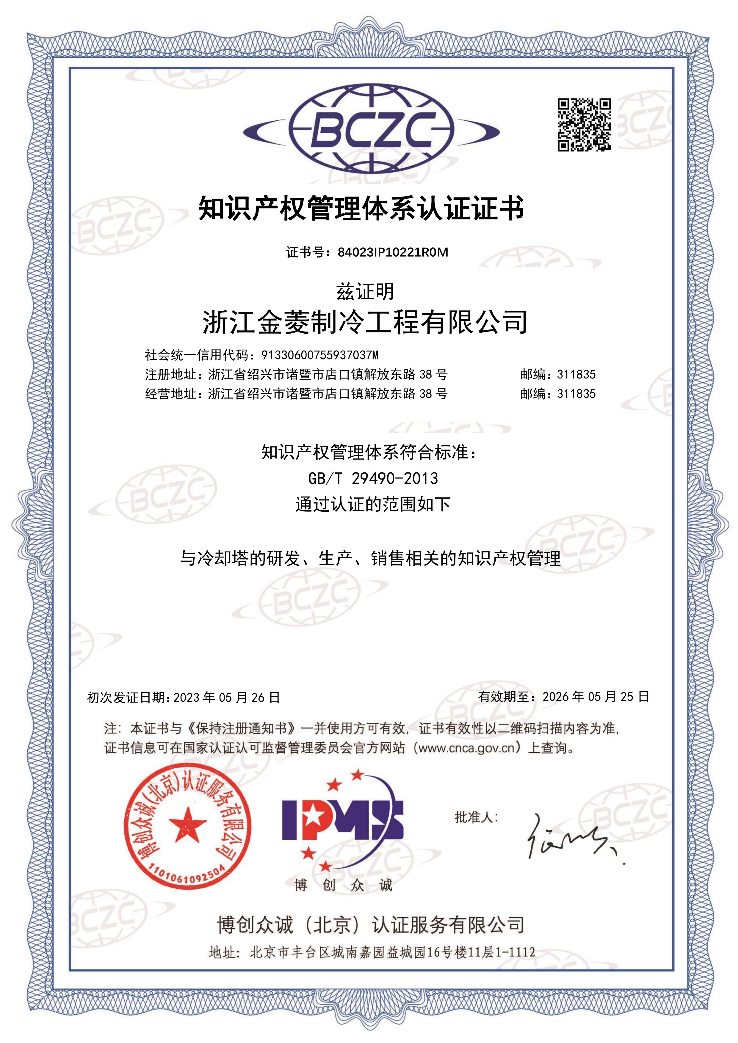 知识产权管理体系认证证书